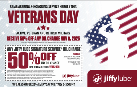 Saluting our hometown heroes! Active, retired and Veteran military can enjoy 50% off ANY oil change on 11/11/25.