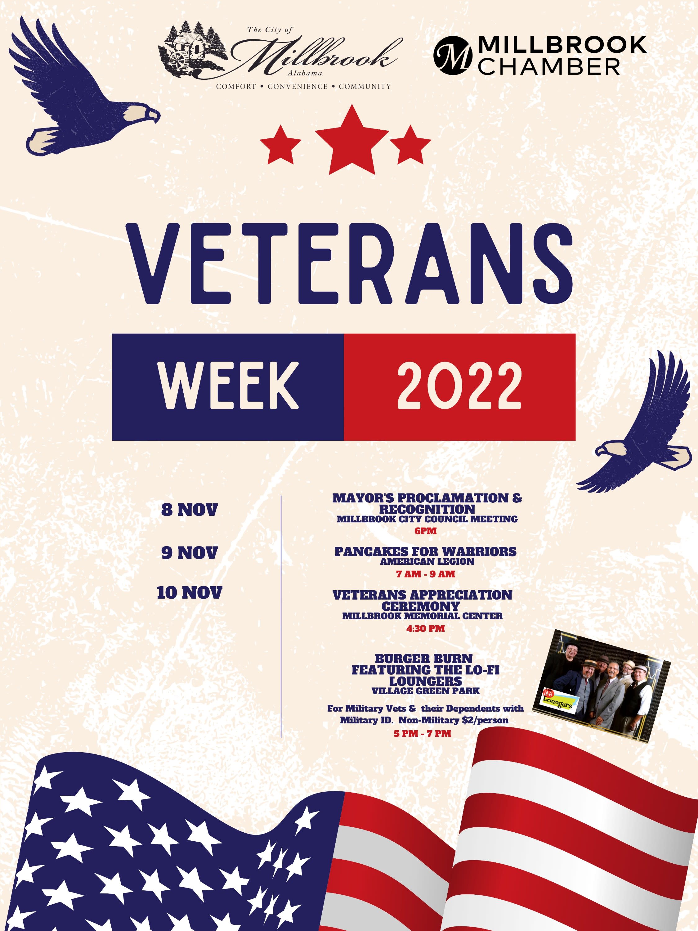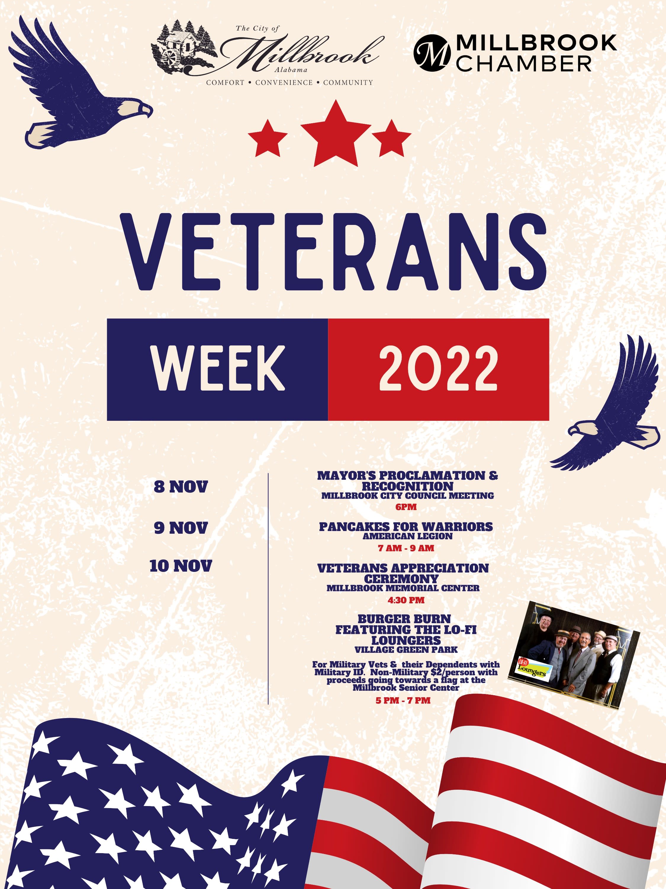 November 8 - 6 p.m. Mayor's Proclamation & Recognition Millbrook City Council November 9 - 7 a.m. - 9 a.m. Pancakes for Warriors American Legion November 10 - 4:30 p.m. Veterans Appreciation Ceremony Millbrook Memorial Center November 10 - 5 p.m. - 7 p.m. Burger Burn Featuring the Lo-Fi Loungers Village Green Park (Free hot dogs or hamburgers for Vets & their dependents. $2/person for all others)