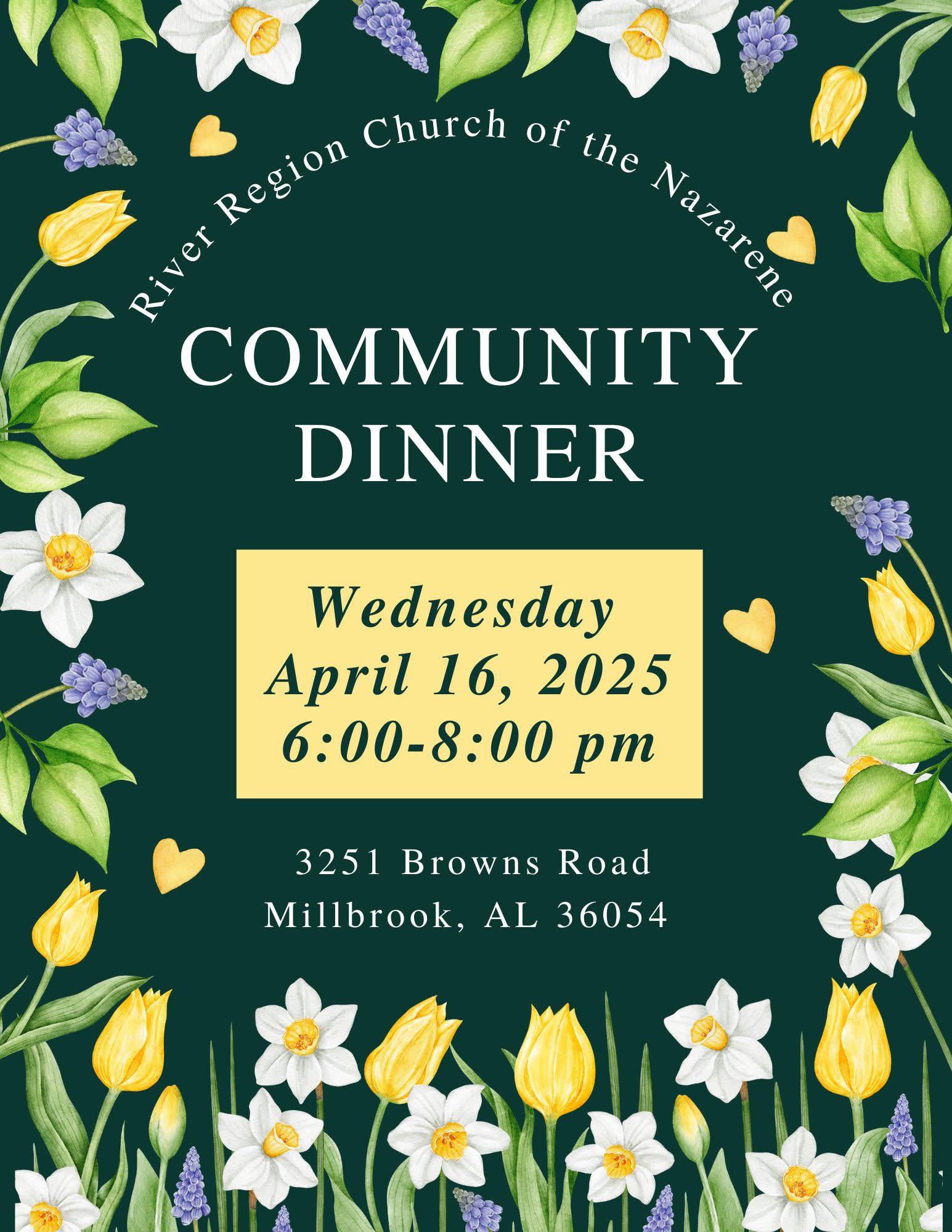 River Region Church of the Nazarene will be serving a free Community dinner on April 16th! Come and sit down to enjoy a free meal for all our families in the River Region! We will begin serving food at 6 pm and serve until 8 pm (or until food runs out!) If you can't stay to sit and eat and would like to pick up a meal to take home, we are serving take out plates from 7:30 pm - 8:00 pm. If you arrive early, we will have our Clothing Closet open for those that need clothes and our Prayer team will be available to pray with anyone who would like it. We look forward to serving you! For more information, visit our Facebook page at https://www.facebook.com/RiverRegionCOTN/